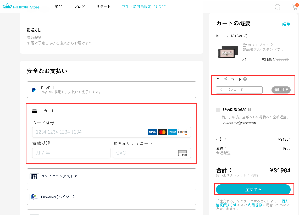 Huion公式オンラインショップでは、クレジットカードを使って注文を支払いすることができます。