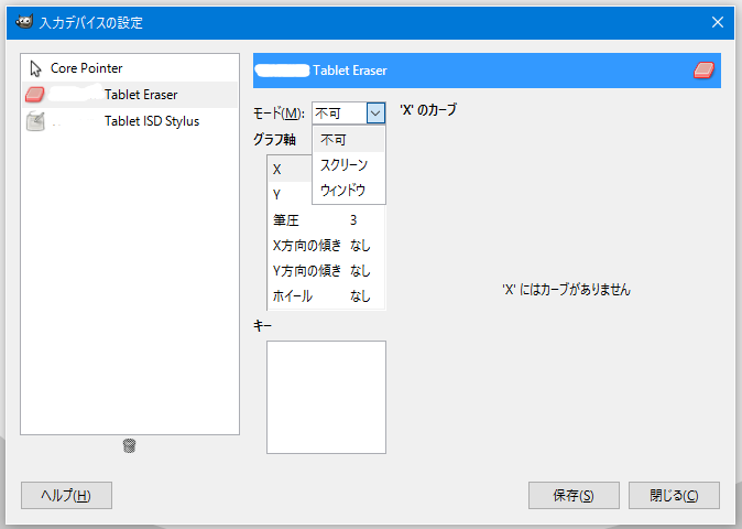 [Tablet Eraser] の [モード] を [不可] から [スクリーン] に変更して [保存]。