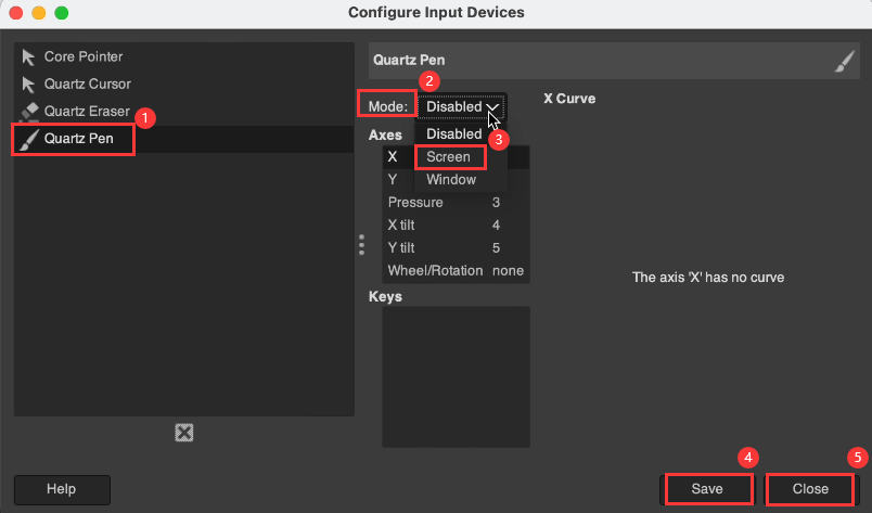 - [Tablet Pen] の [モード] を [不可] から [スクリーン] に変更して [保存]。